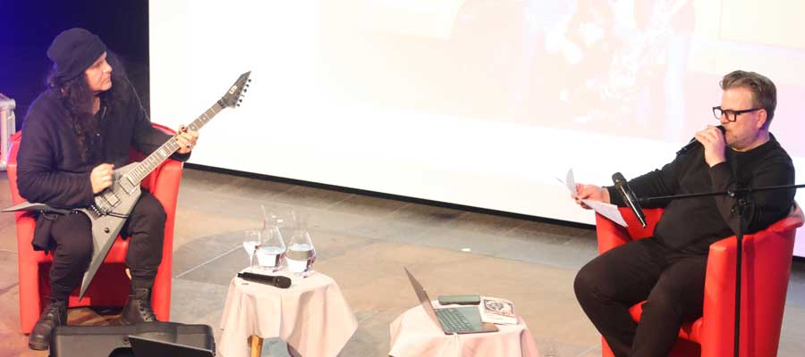 Das Forum des Mariengymnasiums ist bis auf den letzten Platz besetzt: Miland „Mille“ Petrozza freut sich über sein Heimspiel in Werden. Für ihn schließt sich hier ein völlig schlüssiger Kreis.